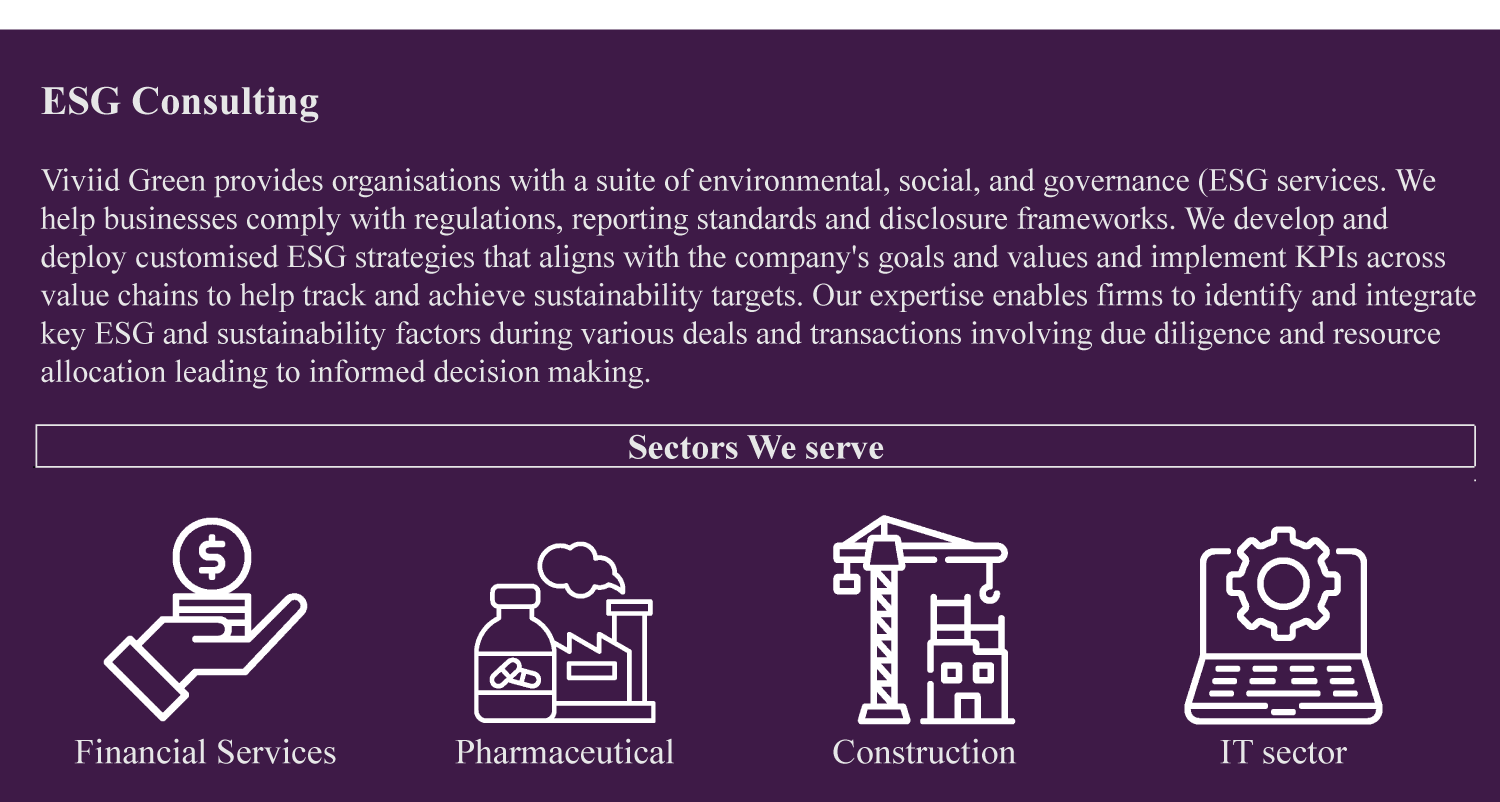 Viviid Green provides organisations with a suite of environmental, social, and governance (ESG) services. We help businesses comply with regulations, reporting standards and disclosure frameworks. We develop and deploy customised ESG strategies that align with the company’s goals and values and implement KPIs across value chains to help track and achieve sustainability targets. Our expertise enables firms to identify and integrate key ESG and sustainability factors during various deals and transactions involving due diligence and resource allocation leading to informed decision making.